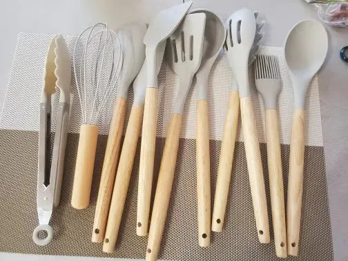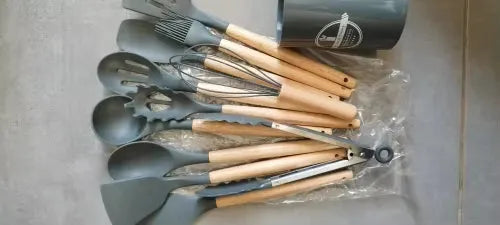 Our Silicone Kitchen Tools Set is meticulously crafted for those who love both cooking and style. The heat-resistant materials ensure that the tools won't warp or melt, while the non-stick surface makes turning and flipping foods a breeze. Their elegant wooden handles provide a comfortable grip and add a touch of sophistication to your kitchen decor. Whether you're a professional chef or a home cook, these utensils are designed to meet all your culinary needs with ease and elegance. A must-have addition for anyone looking to upgrade their kitchen experience.
